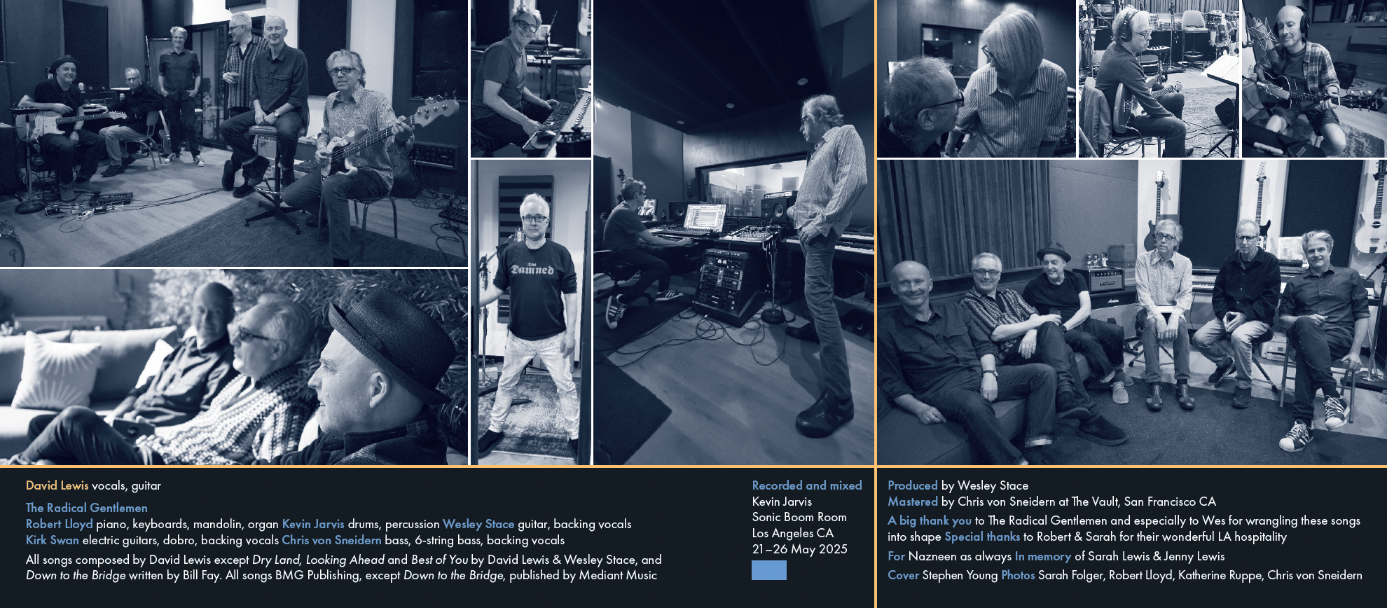 The exquisite new album from David Lewis, produced by Wes, and performed by The Radical Gentlemen, their first reunion for a few years; recorded over a very happy week in Los Angeles by Kevin Jarvis at Sonic Boom Room, Los Angeles CA, 21-26 May 2025